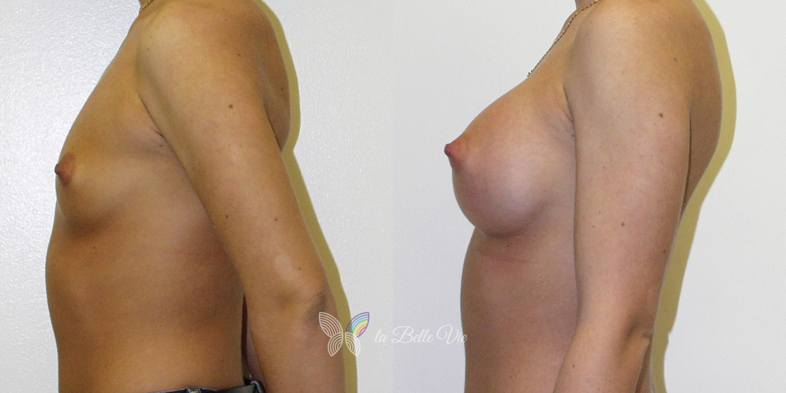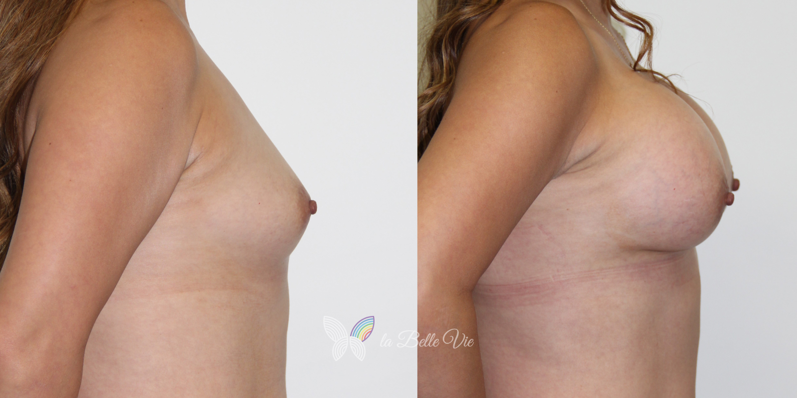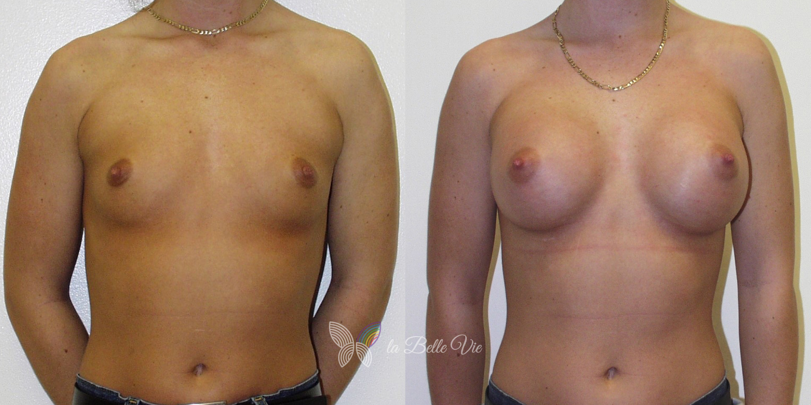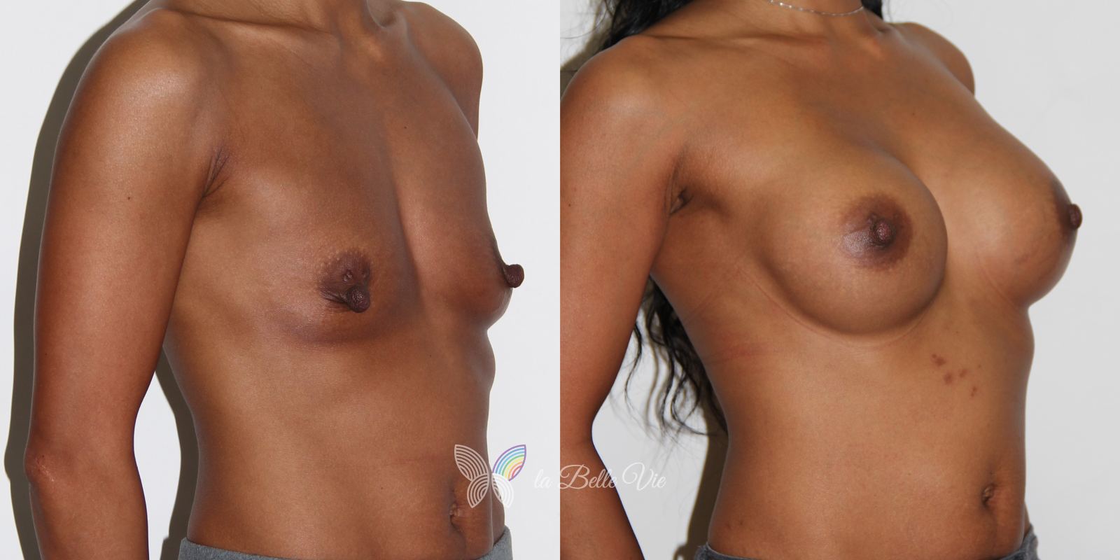 Before: 39-year-old woman here to see us for consultation on breast augmentation. She has had two children 10 years ago. She has noticed significant changes in her breasts, especially with her nipples and changing volume. On examination, she is a petite woman with small breasts.