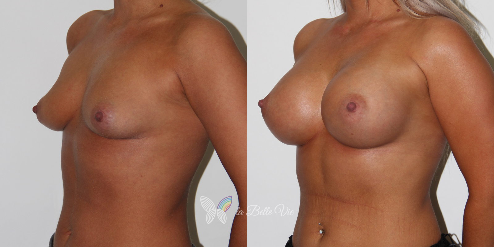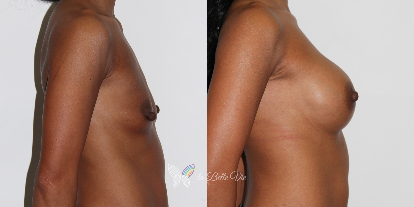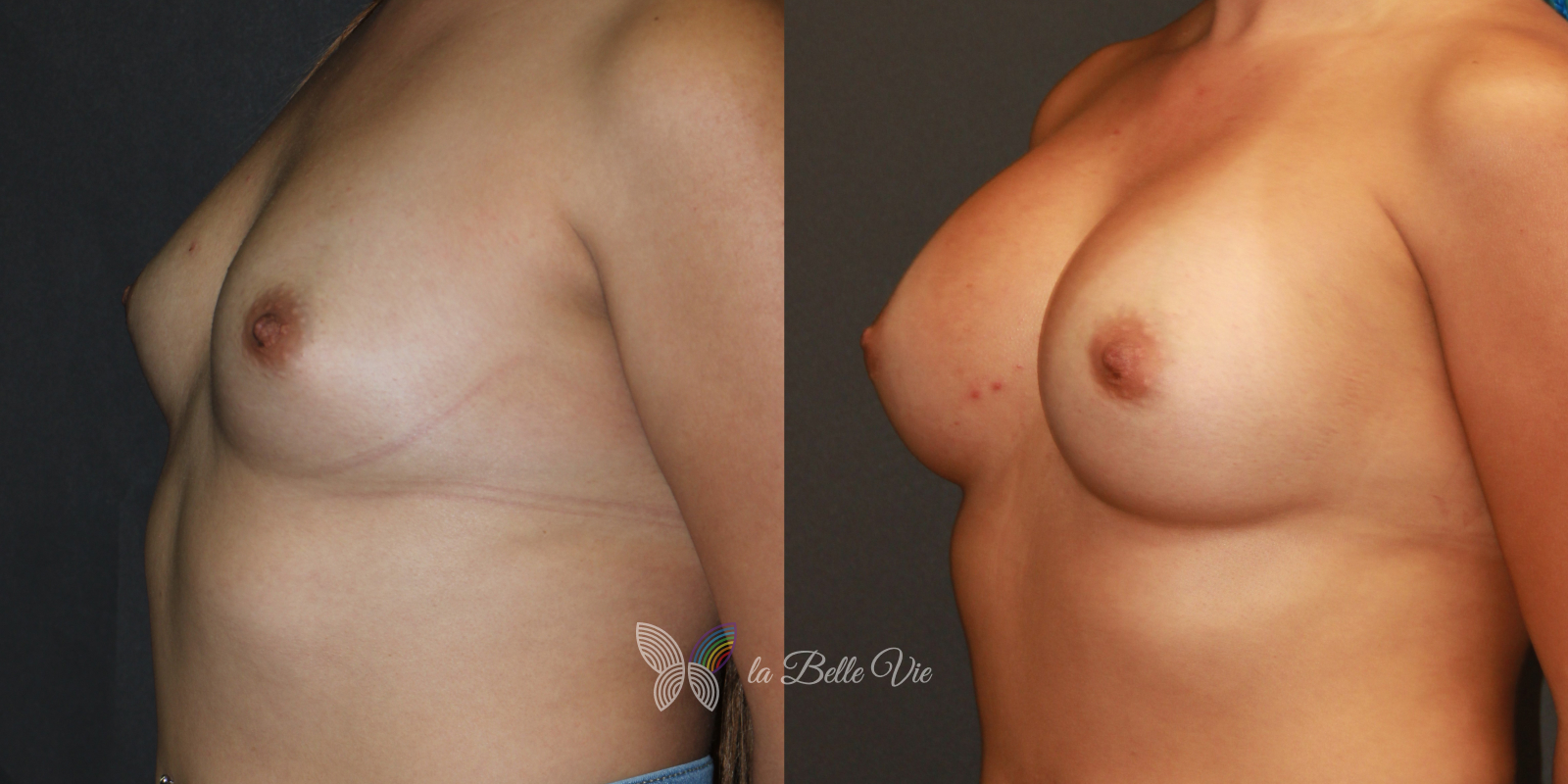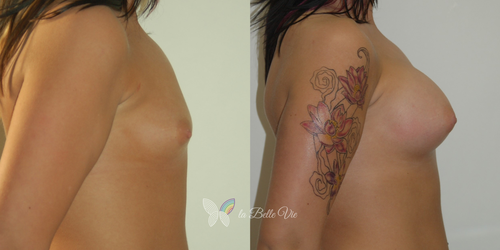 Before: 39-year-old woman here to see us for consultation on breast augmentation. She has had two children 10 years ago. She has noticed significant changes in her breasts, especially with her nipples and changing volume. On examination, she is a petite woman with small breasts.