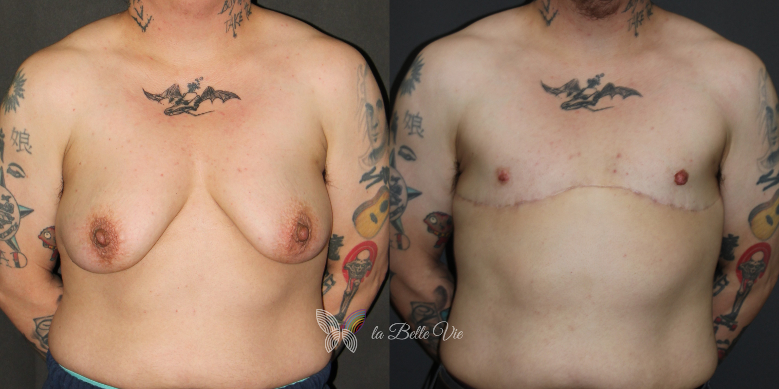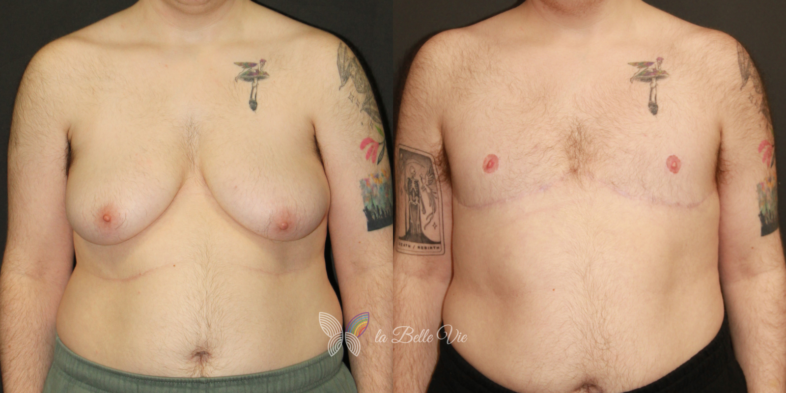 After: On examination, the patient demonstrates a well-defined, masculine chest contour. The incisions have healed beautifully and are nearly undetectable beneath the chest hair. Nipple grafts show excellent healing and uniform pigmentation. There are no dog-ear deformities bilaterally.