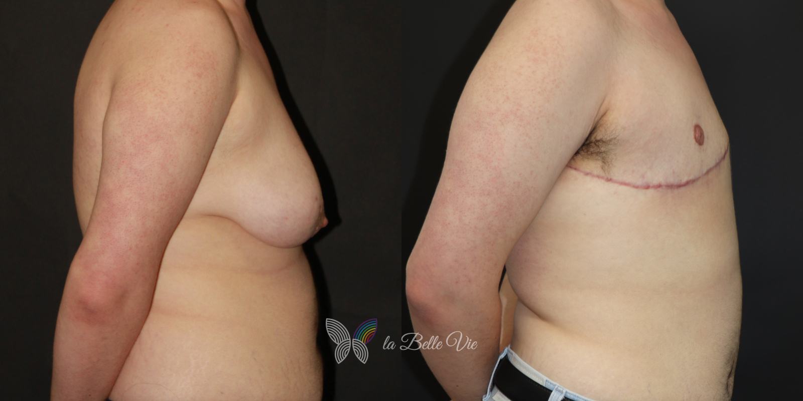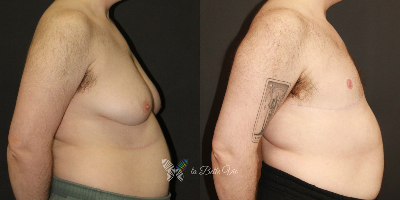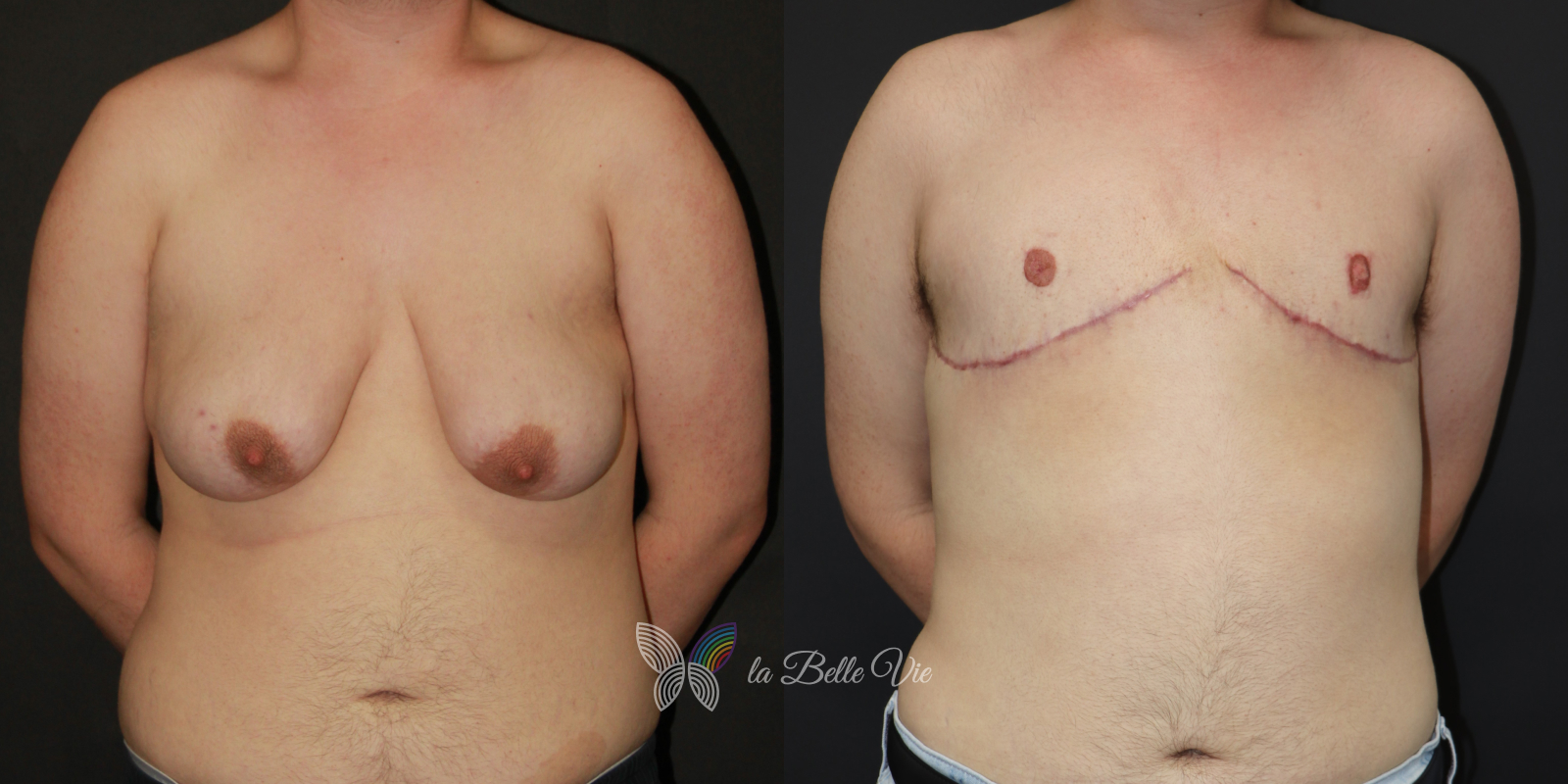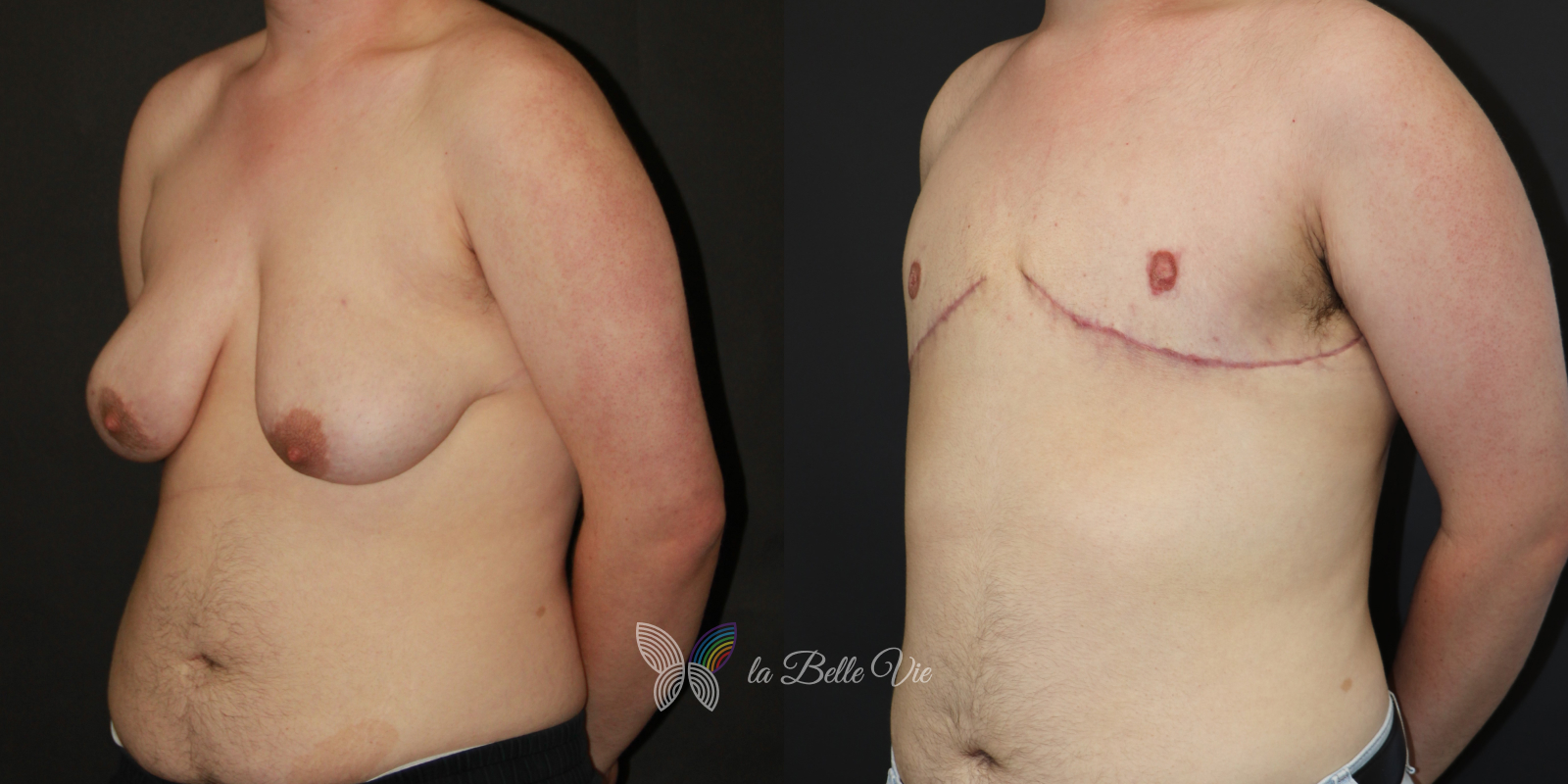Before: The patient is 5 feet 2 inches tall and weighs 174 pounds, with a body mass index (BMI) of 32. On examination, he presents with moderately large breasts demonstrating bilateral Grade 3 ptosis. There is no evidence of a lateral chest roll. The patient desires a double-incision mastectomy with free nipple grafts to achieve a more masculine chest contour.