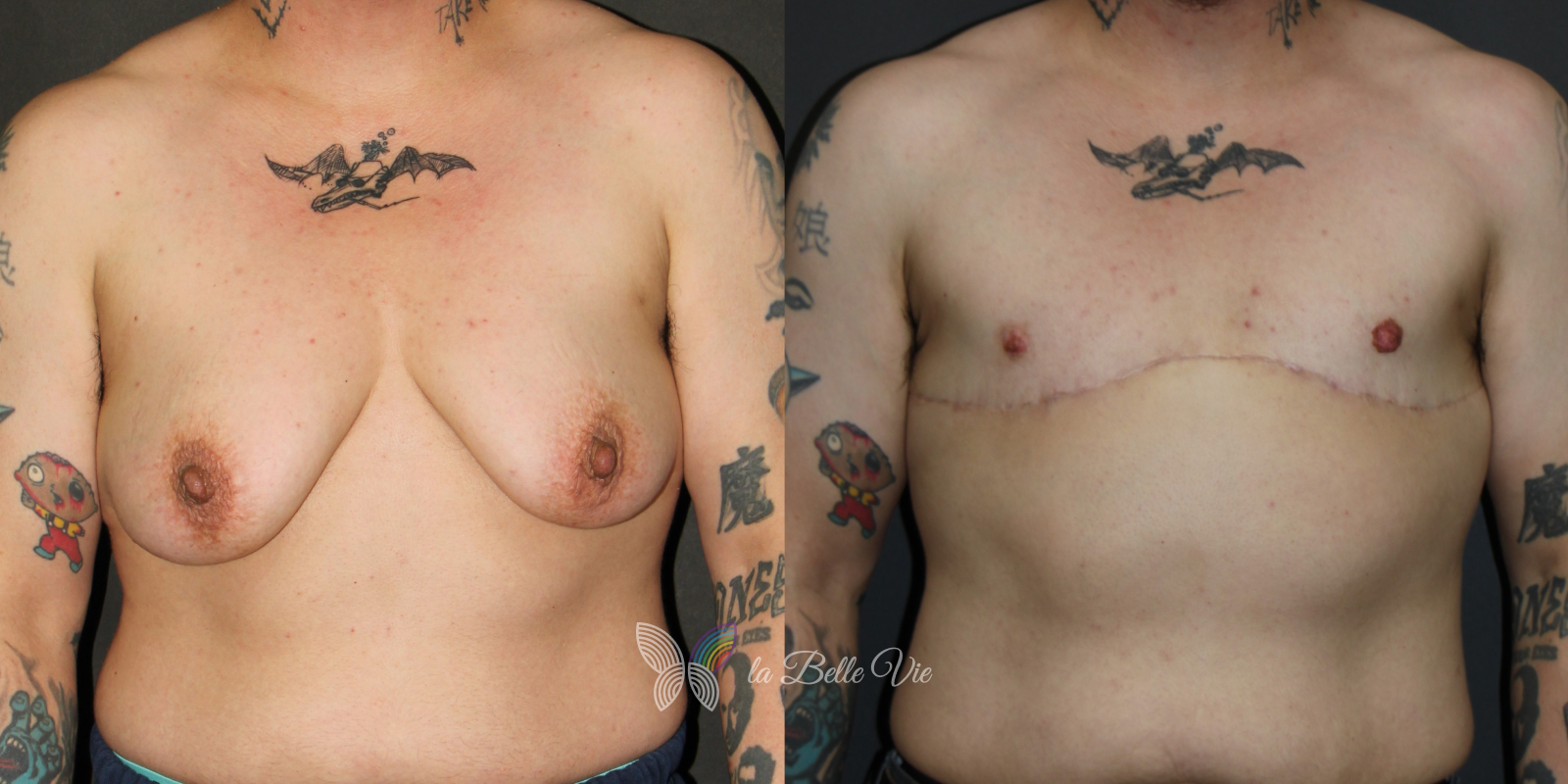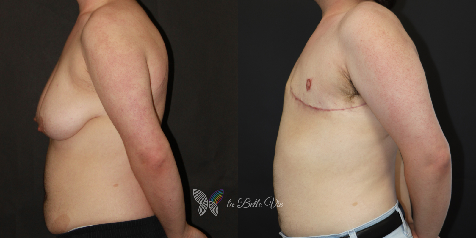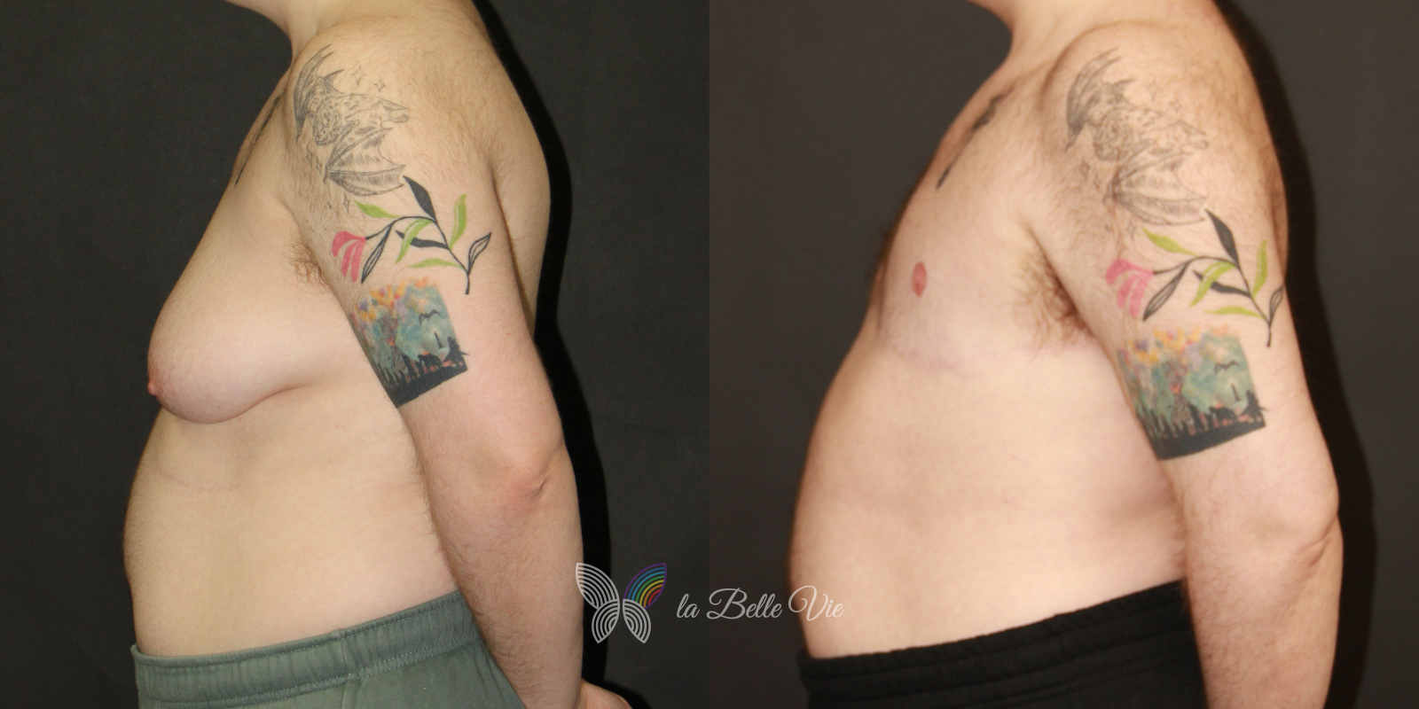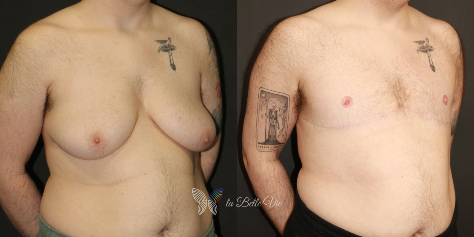 Before: The patient is 5 feet 2 inches tall and weighs 174 pounds, with a body mass index (BMI) of 32. On examination, he presents with moderately large breasts demonstrating bilateral Grade 3 ptosis. There is no evidence of a lateral chest roll. The patient desires a double-incision mastectomy with free nipple grafts to achieve a more masculine chest contour.