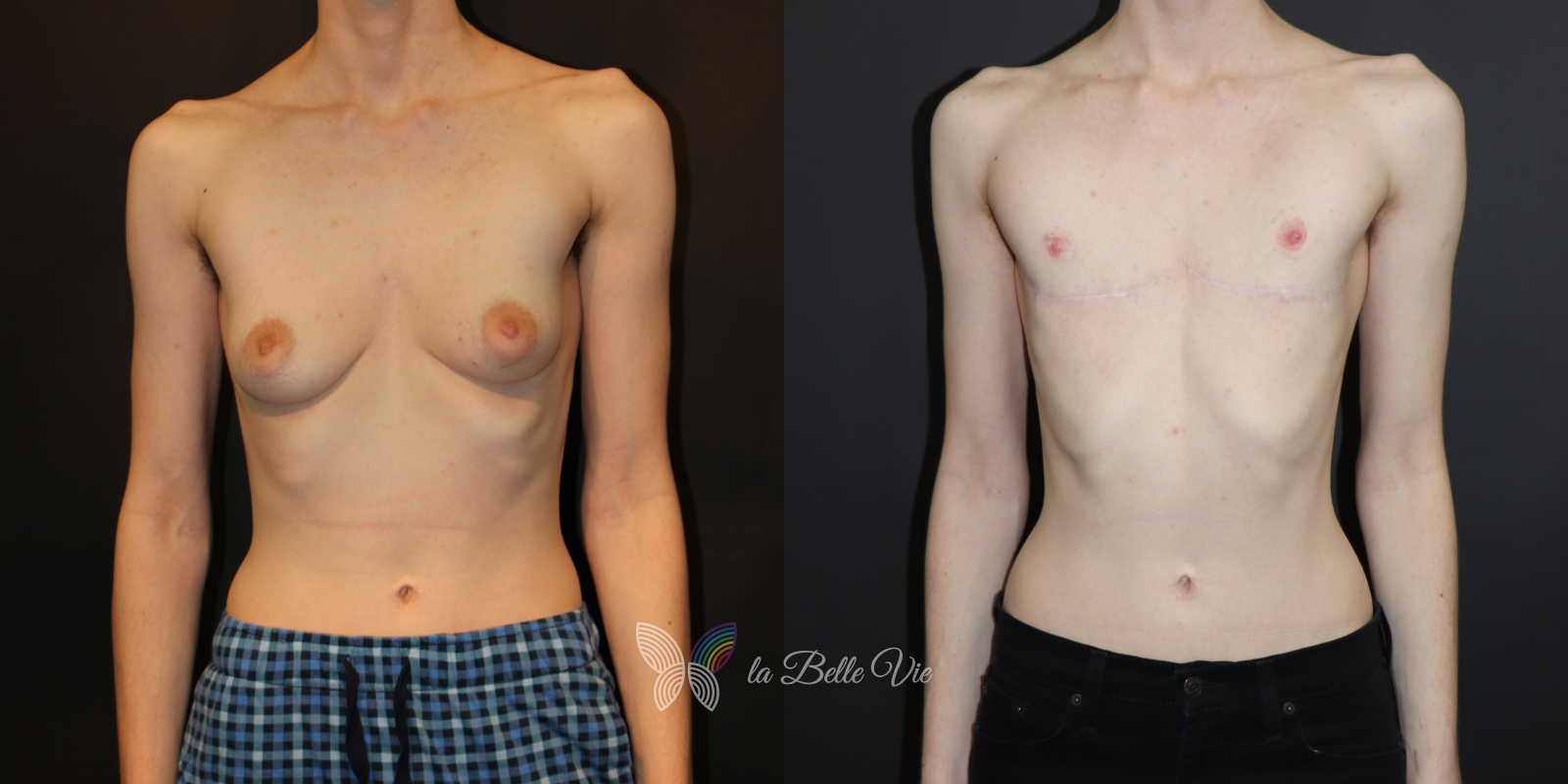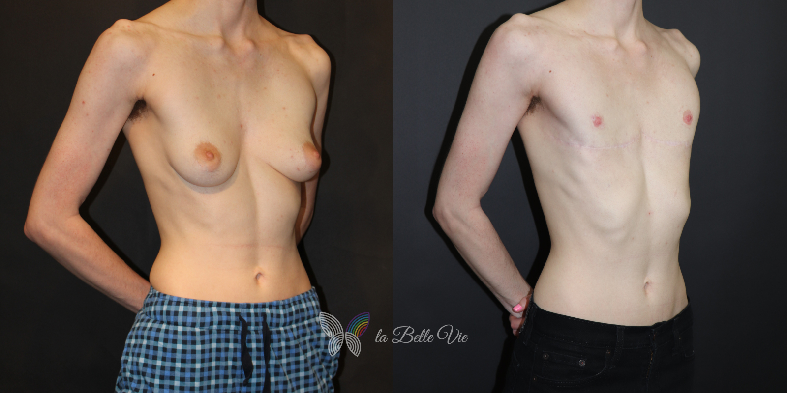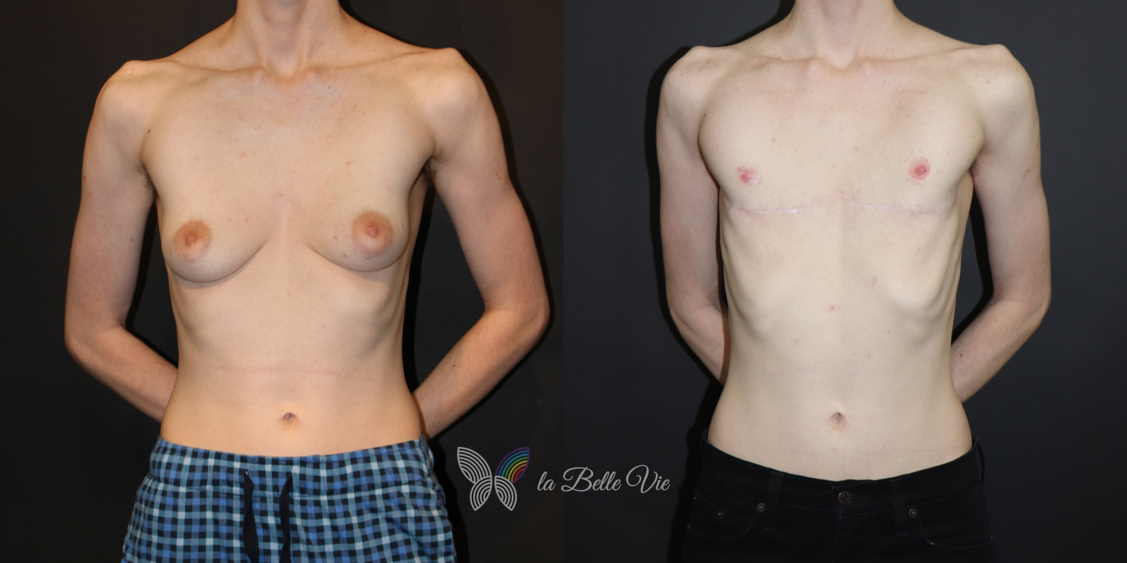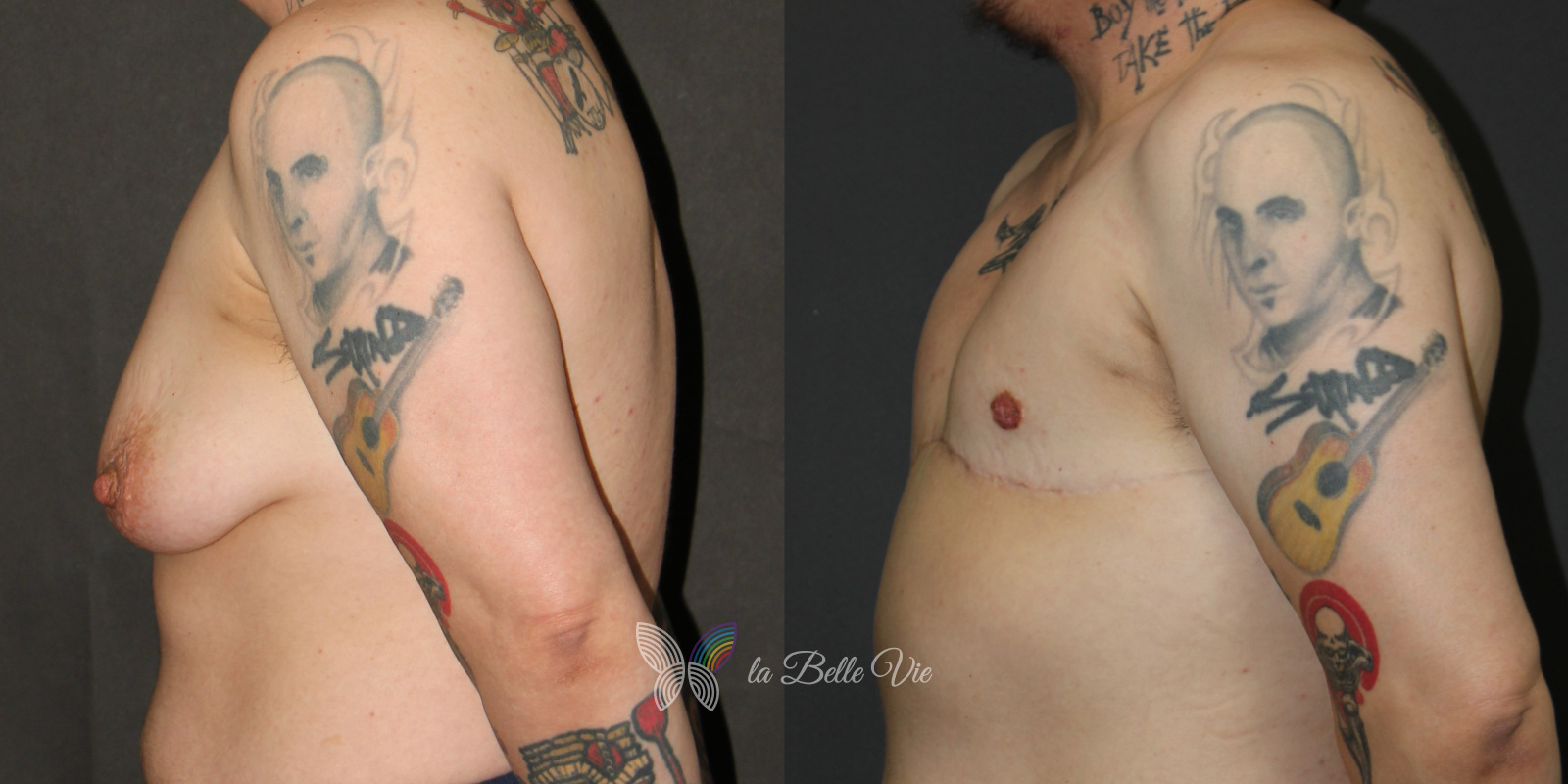 Before: The patient is 5 feet 2 inches tall and weighs 174 pounds, with a body mass index (BMI) of 32. On examination, he presents with moderately large breasts demonstrating bilateral Grade 3 ptosis. There is no evidence of a lateral chest roll. The patient desires a double-incision mastectomy with free nipple grafts to achieve a more masculine chest contour.