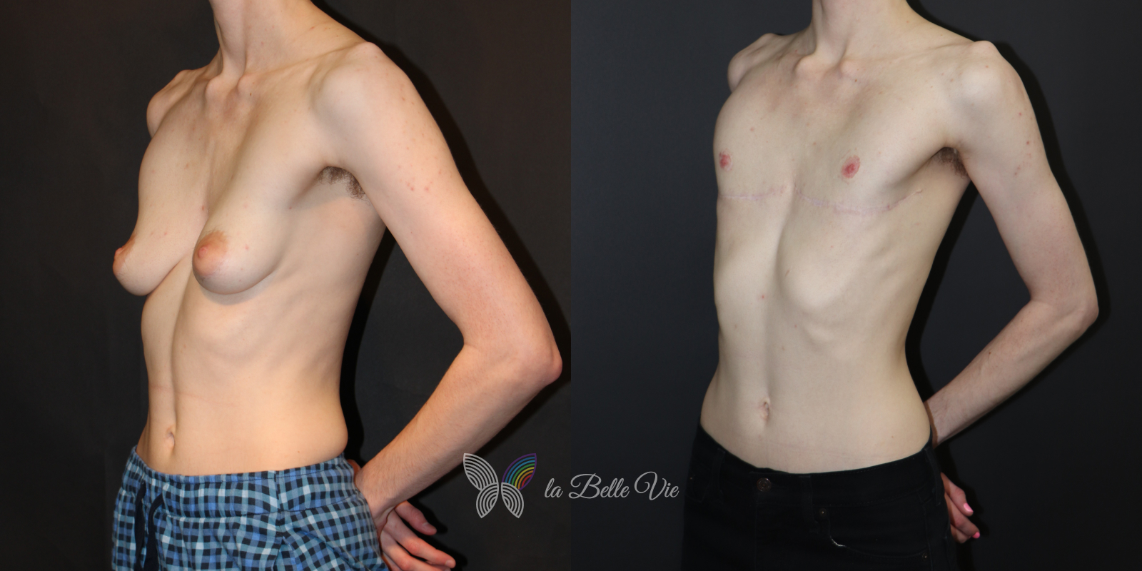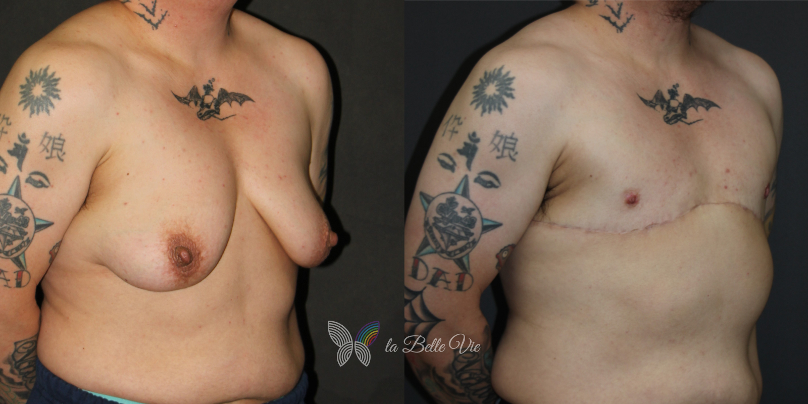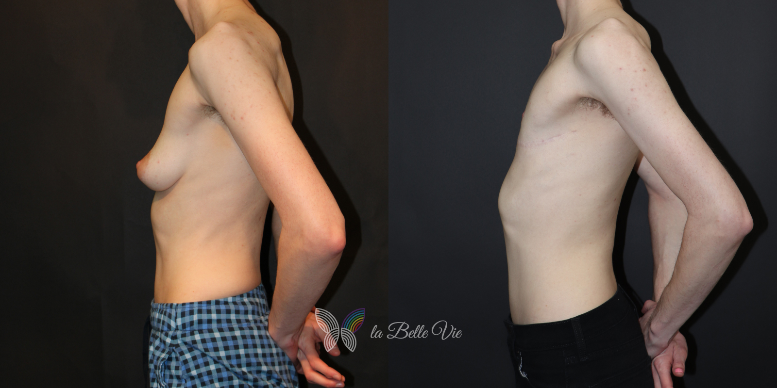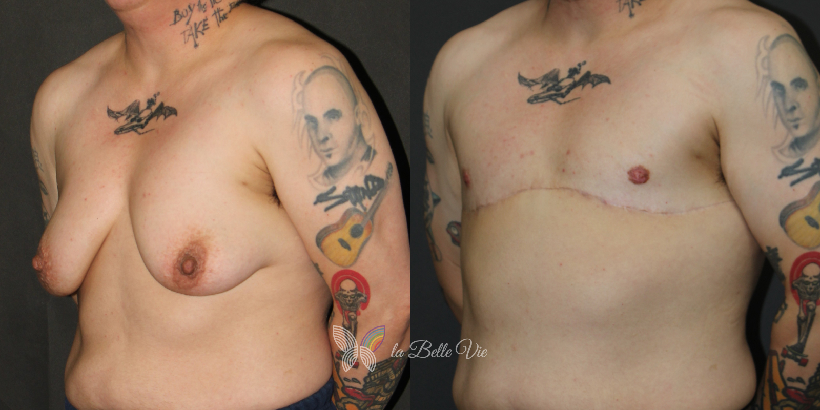 Before: The patient is 5 feet 2 inches tall and weighs 174 pounds, with a body mass index (BMI) of 32. On examination, he presents with moderately large breasts demonstrating bilateral Grade 3 ptosis. There is no evidence of a lateral chest roll. The patient desires a double-incision mastectomy with free nipple grafts to achieve a more masculine chest contour.