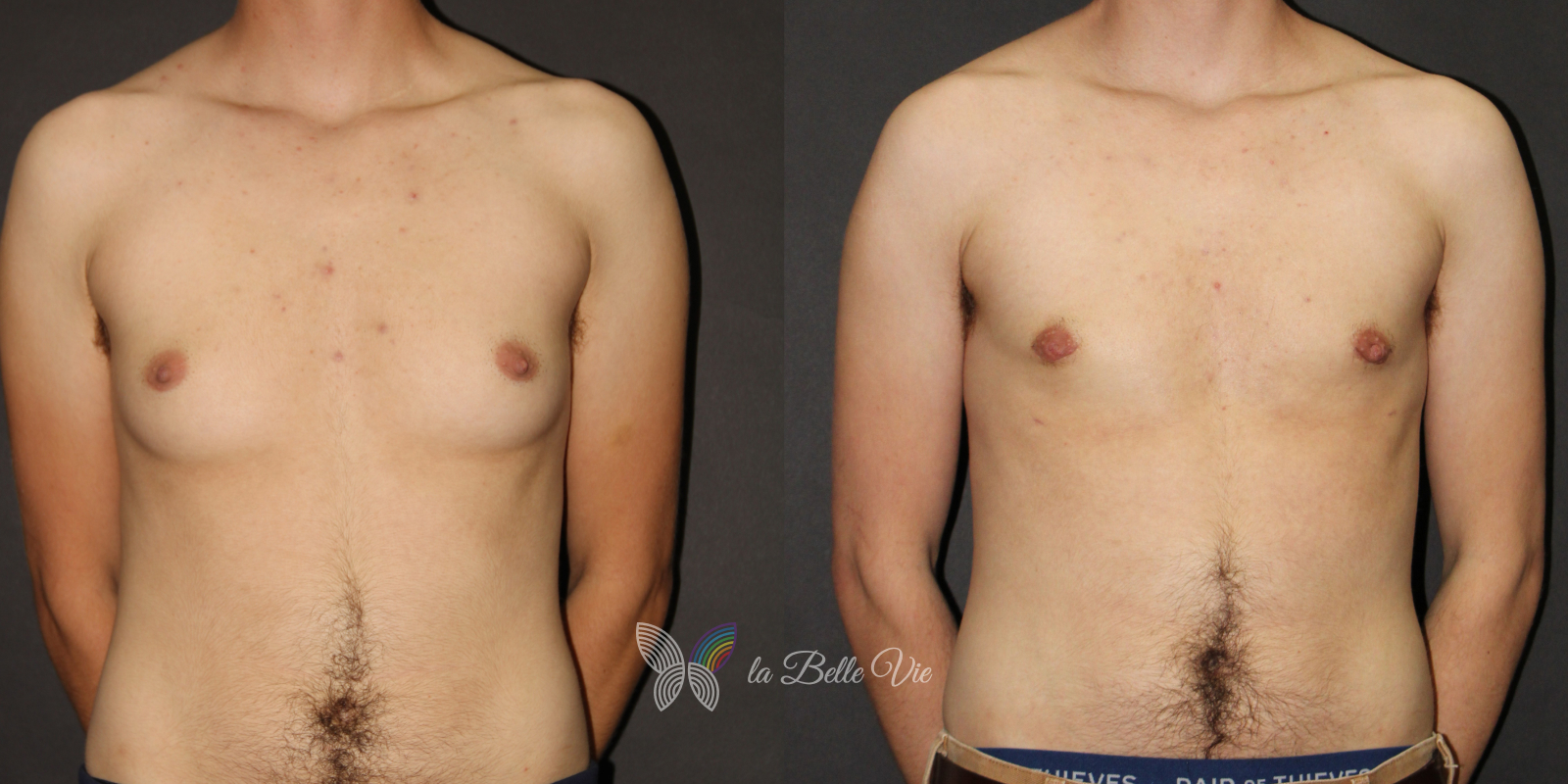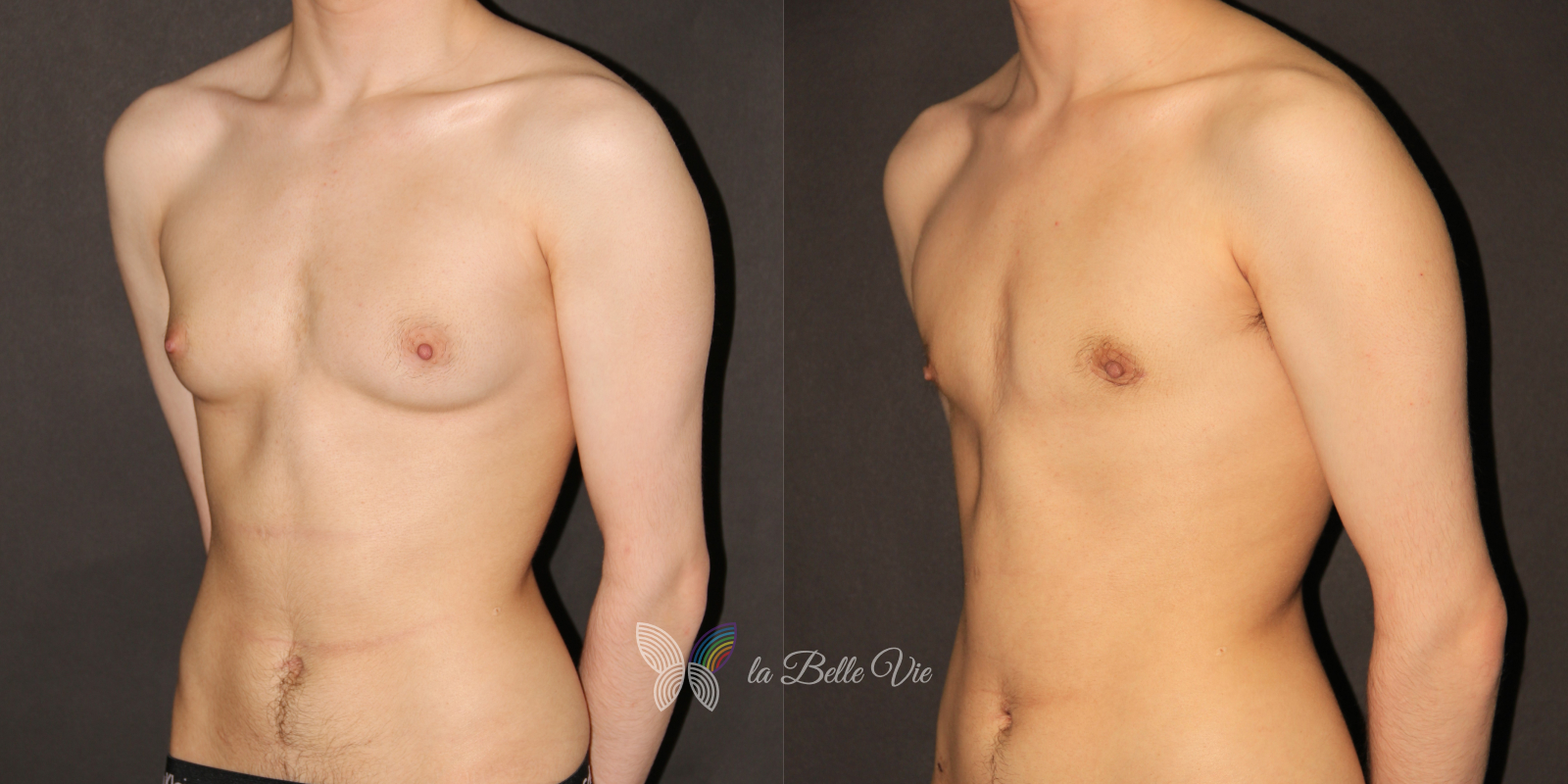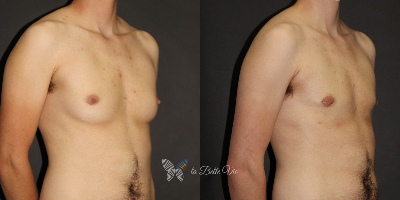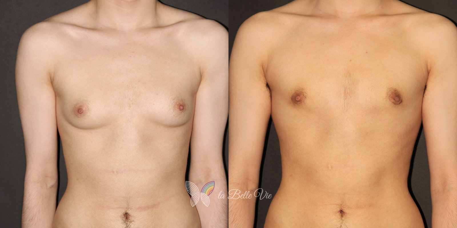 Before: The patient is 5 feet 4 inches tall, weighs 120 pounds, and has a body mass index (BMI) of 22.3. On examination, he presents with a small chest without ptosis. He has previously been on puberty blockers, which limited breast development; however, he is dissatisfied with the small feminine contour and desires removal.