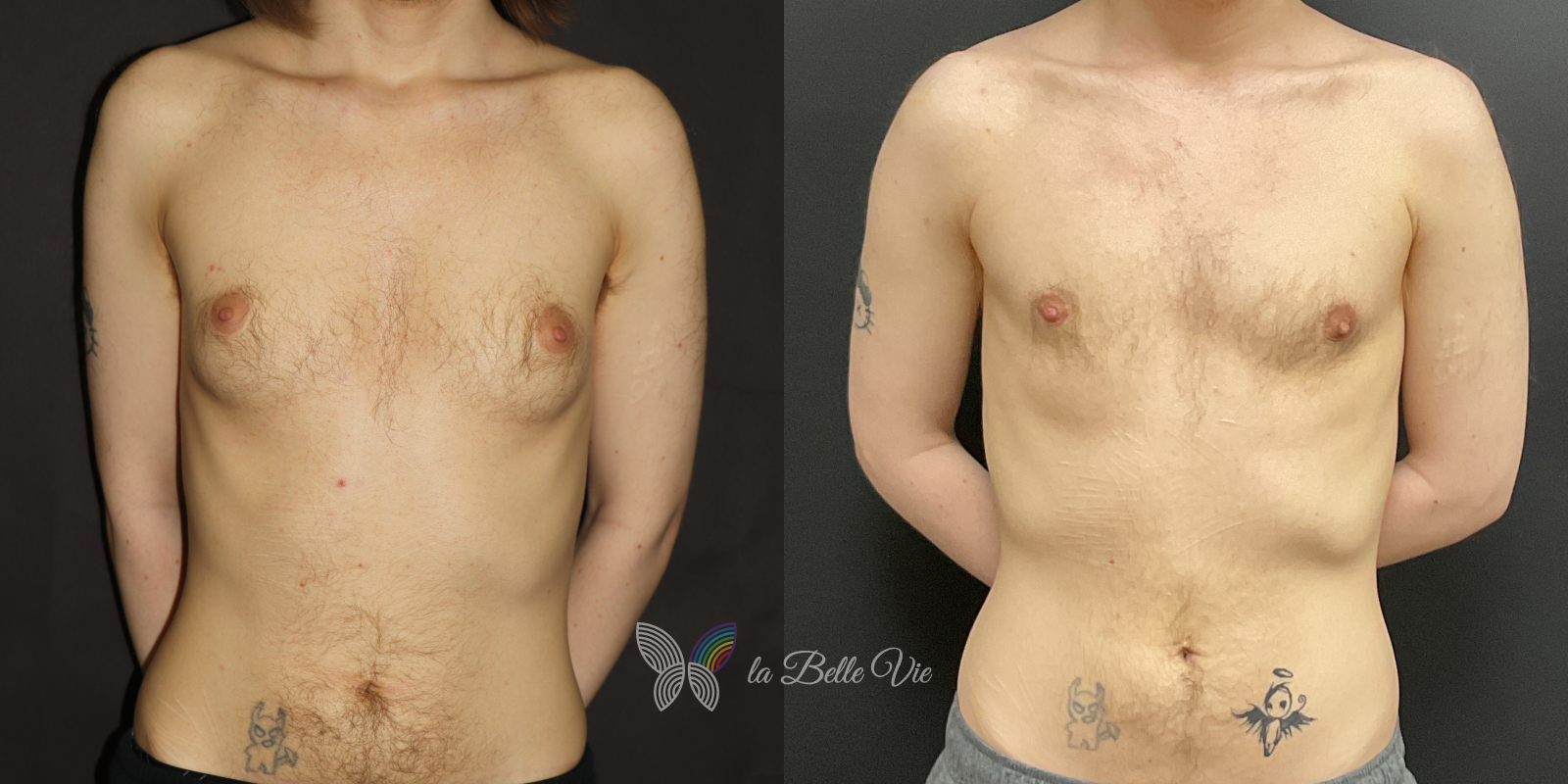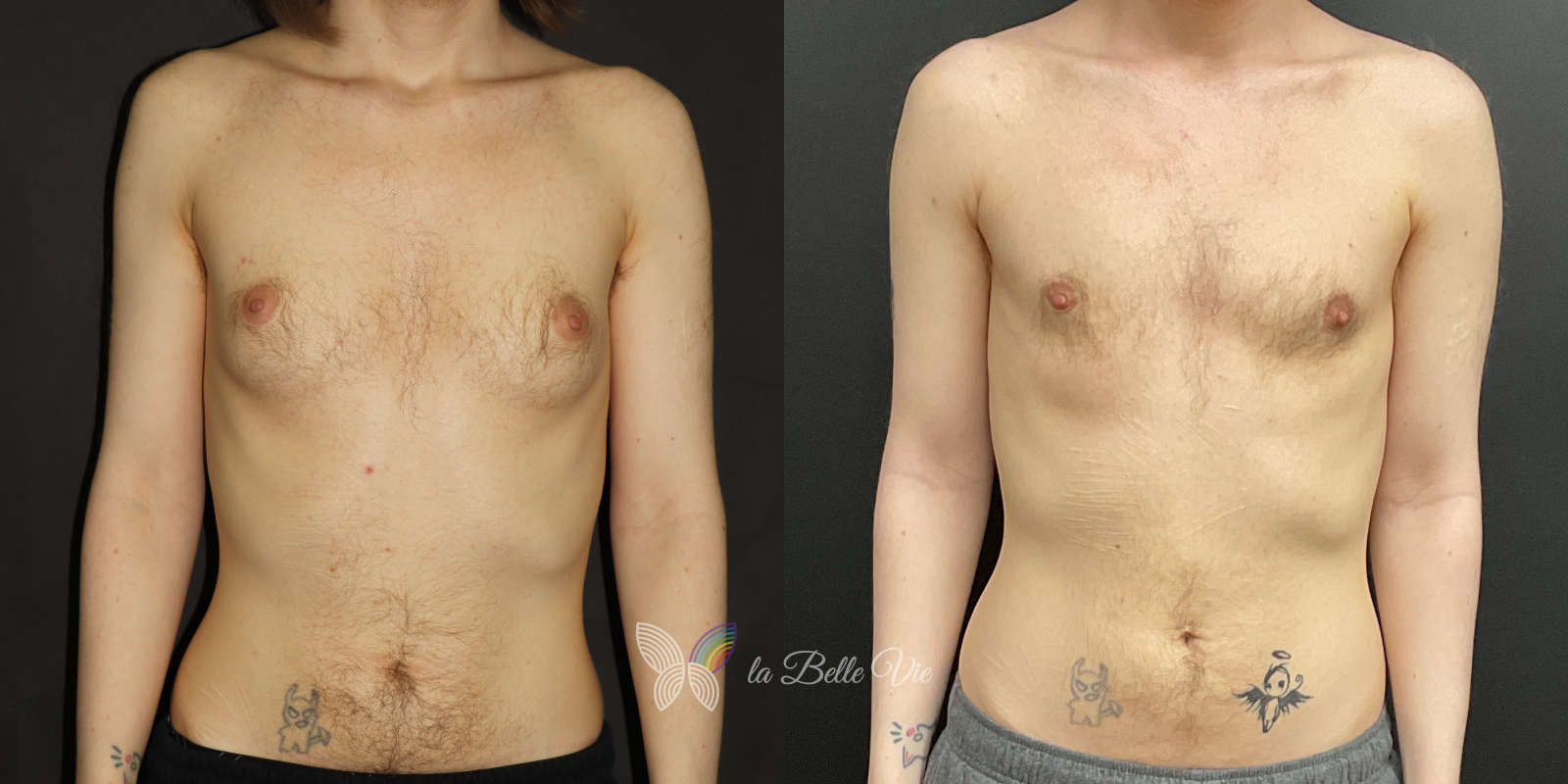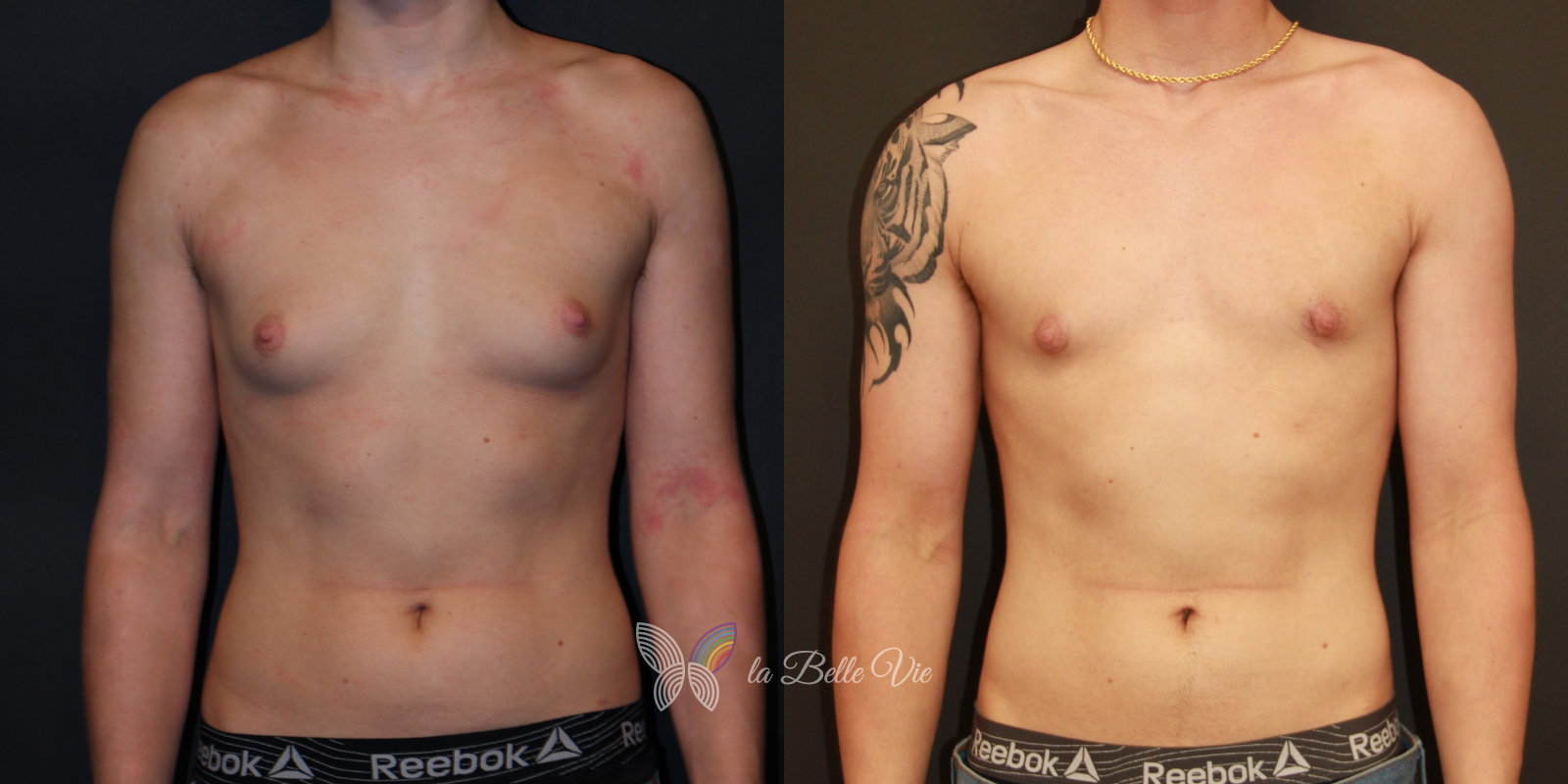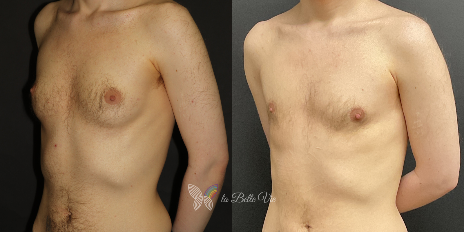 Before: The patient is 5 feet 4 inches tall, weighs 120 pounds, and has a body mass index (BMI) of 22.3. On examination, he presents with a small chest without ptosis. He has previously been on puberty blockers, which limited breast development; however, he is dissatisfied with the small feminine contour and desires removal.