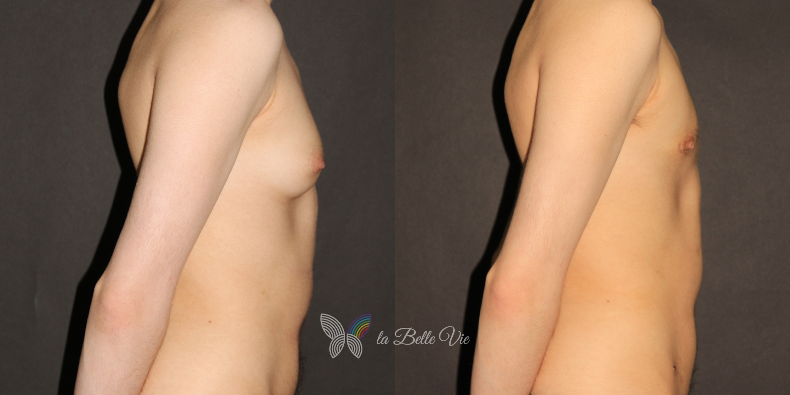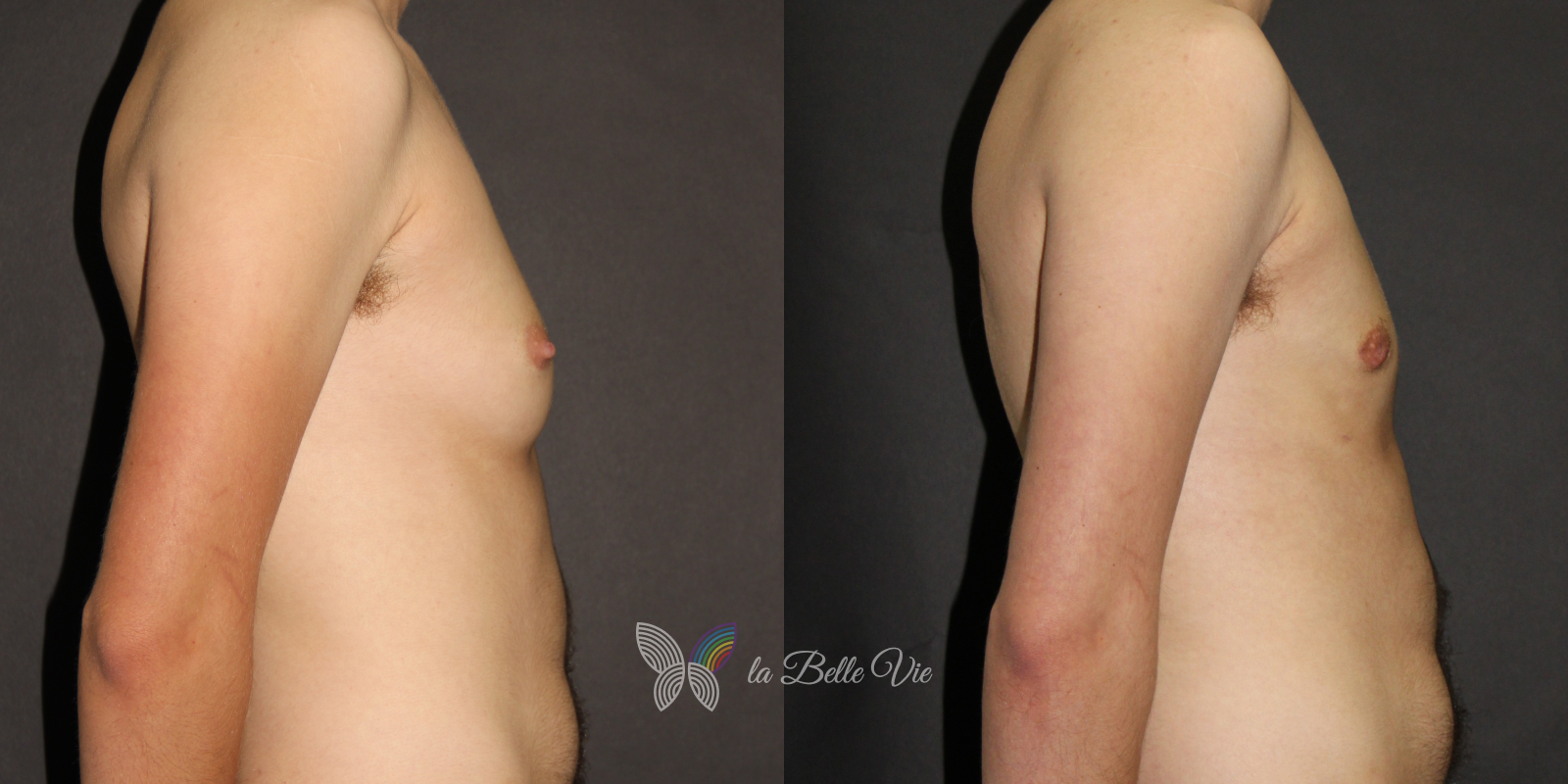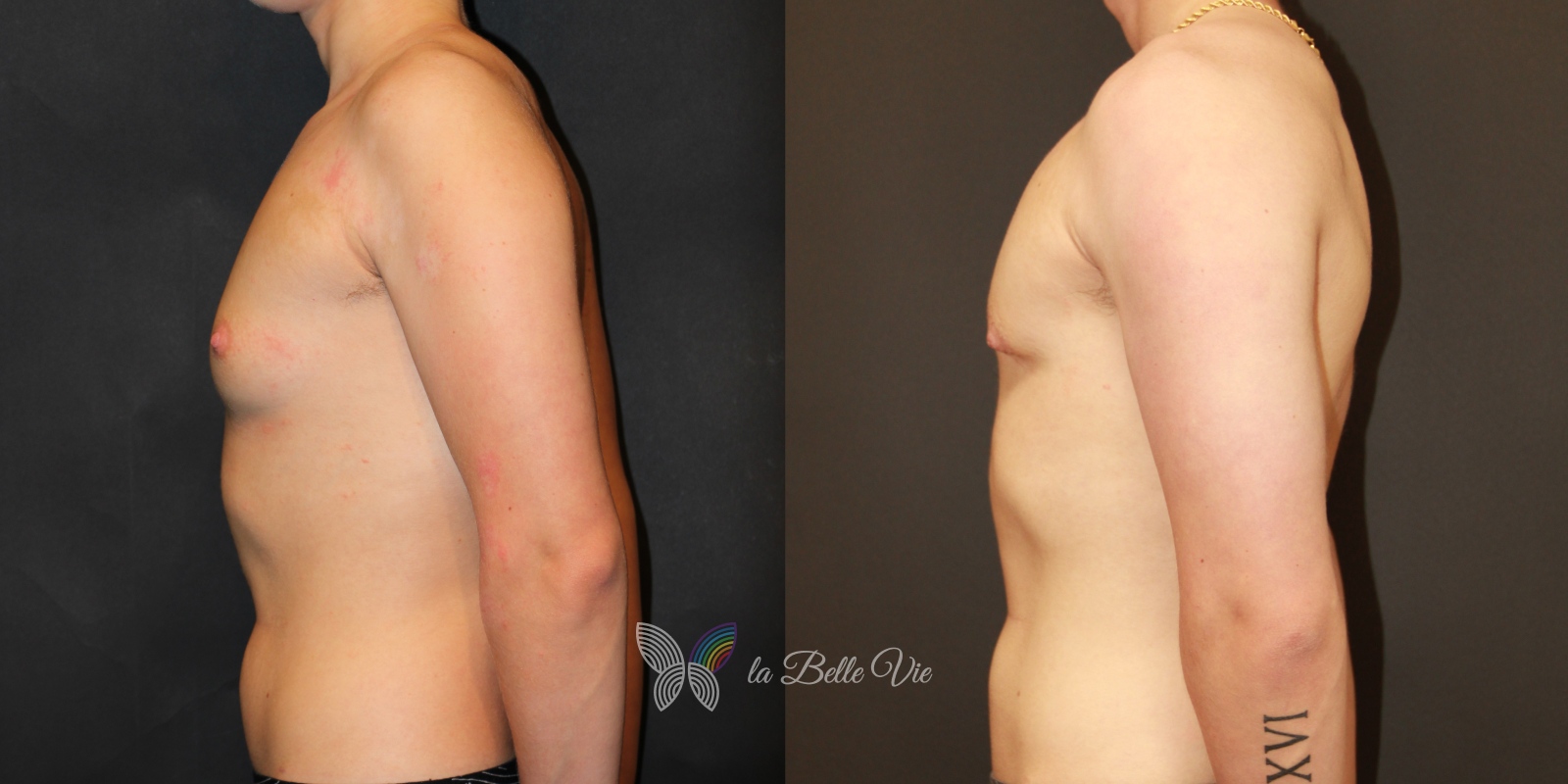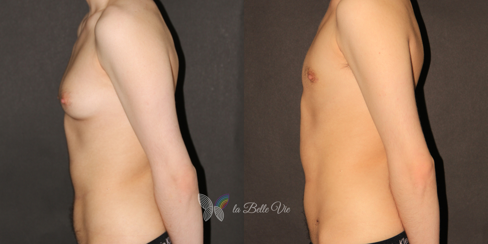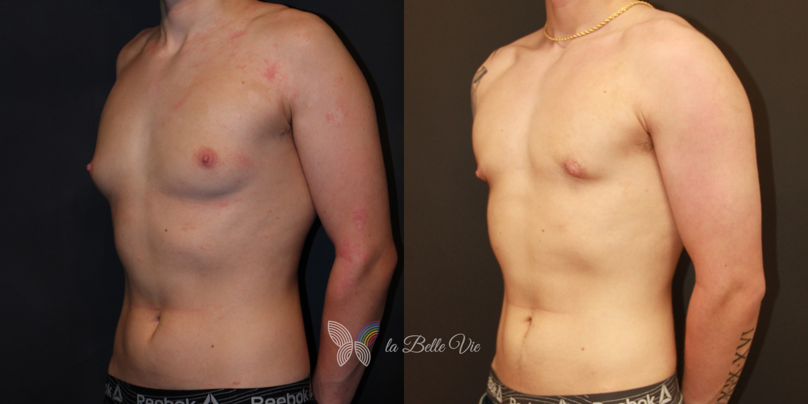 Before: The patient is 5 feet 4 inches tall, weighs 120 pounds, and has a body mass index (BMI) of 22.3. On examination, he presents with a small chest without ptosis. He has previously been on puberty blockers, which limited breast development; however, he is dissatisfied with the small feminine contour and desires removal.