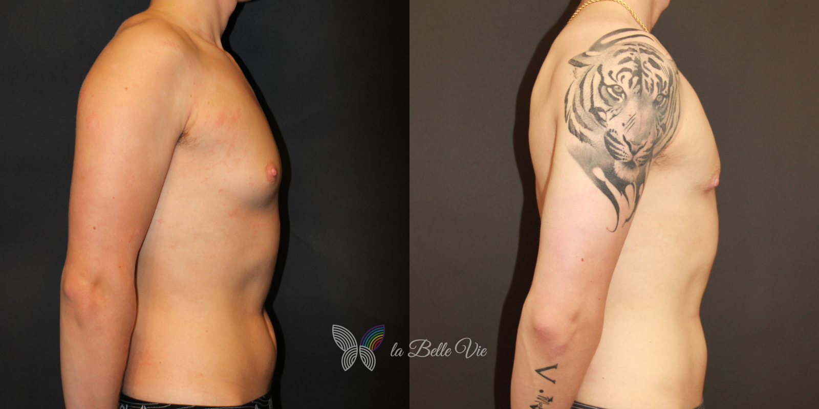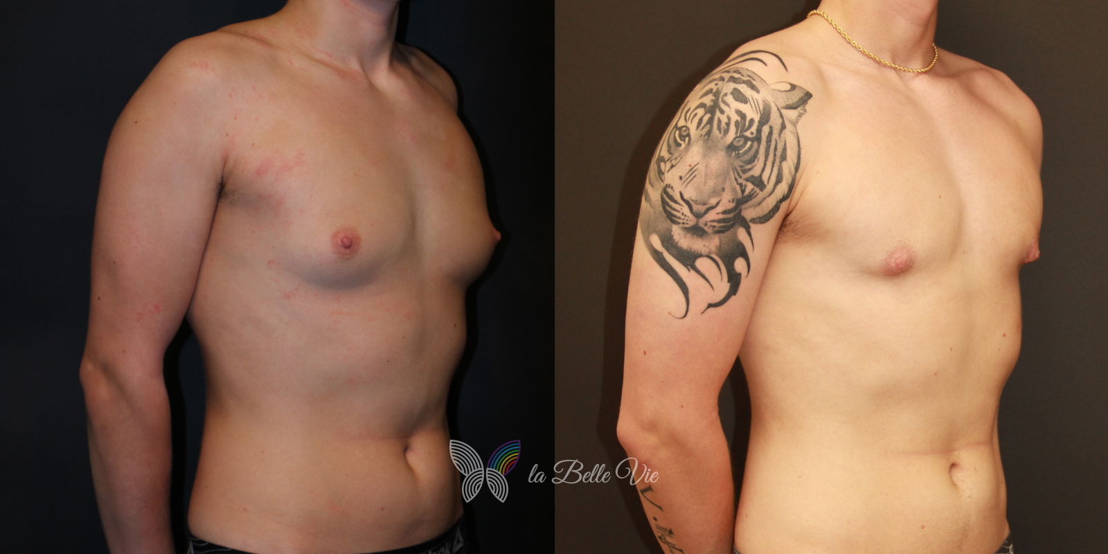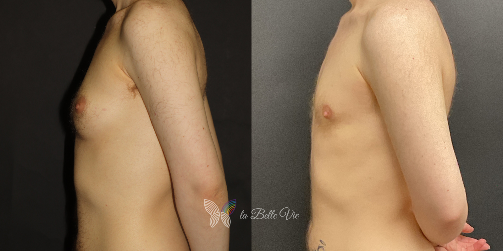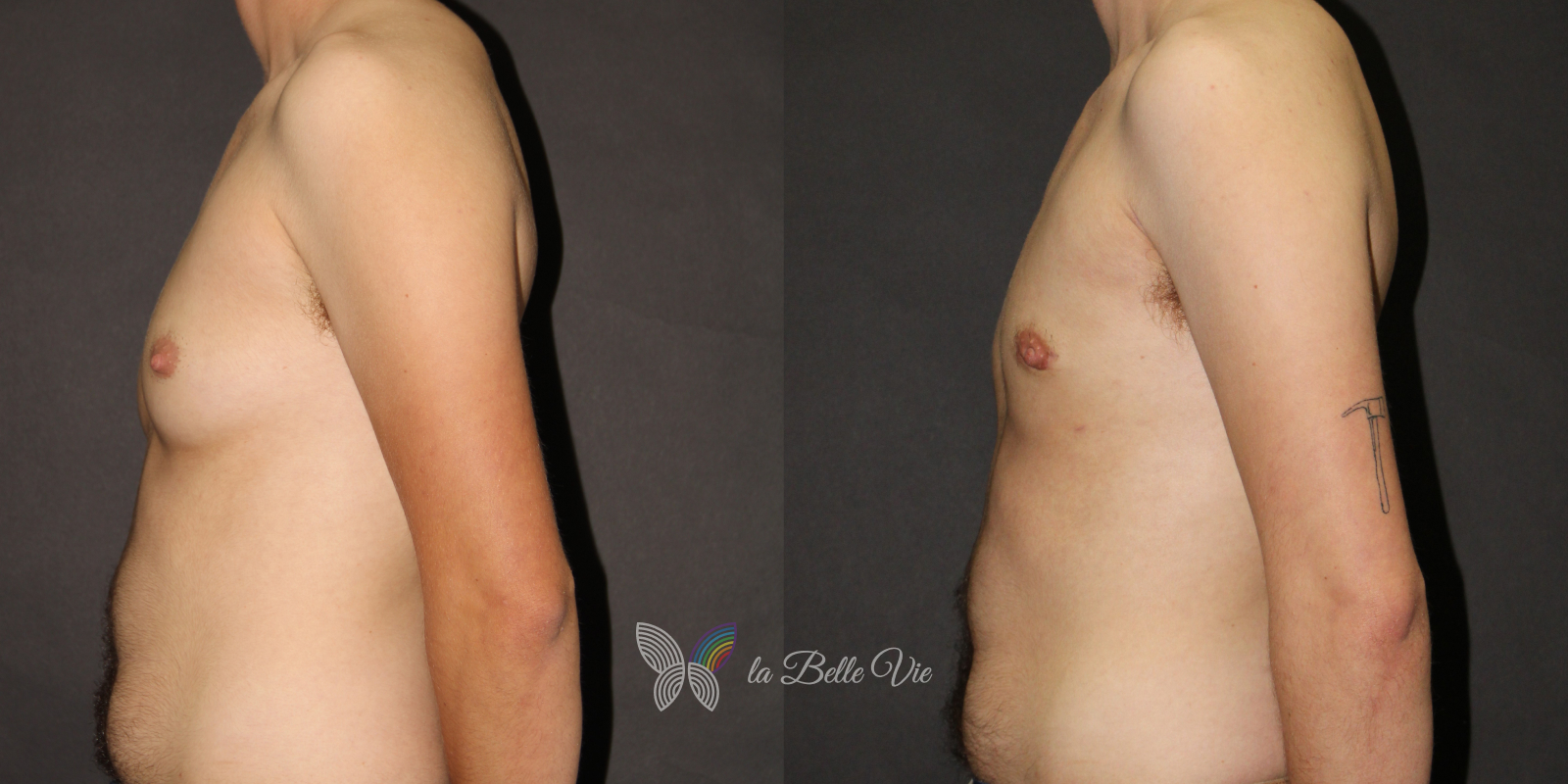 Before: The patient is 5 feet 4 inches tall, weighs 120 pounds, and has a body mass index (BMI) of 22.3. On examination, he presents with a small chest without ptosis. He has previously been on puberty blockers, which limited breast development; however, he is dissatisfied with the small feminine contour and desires removal.