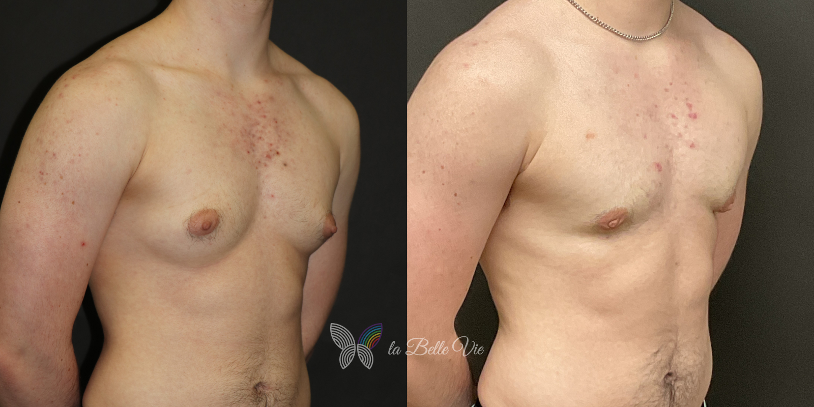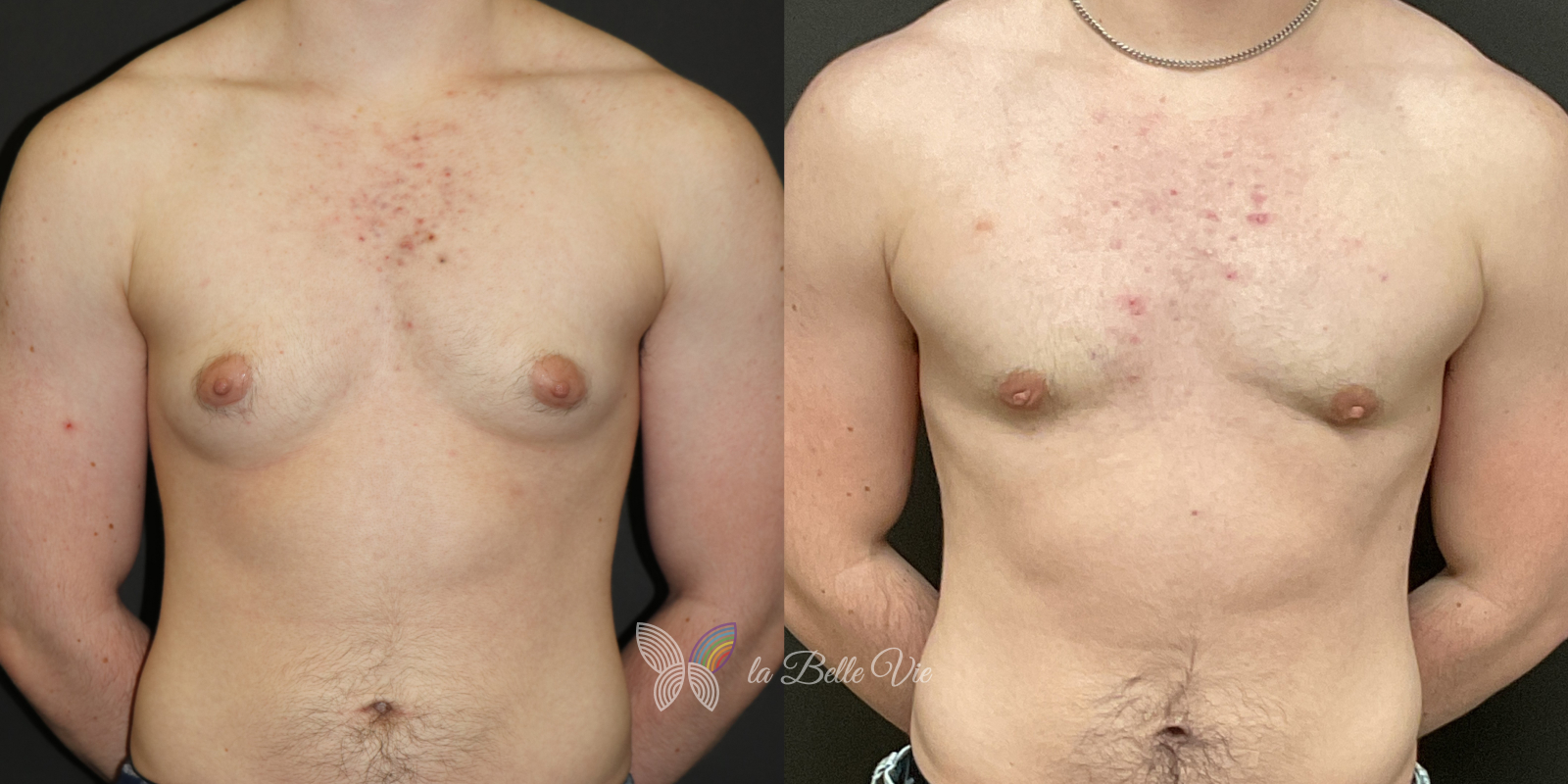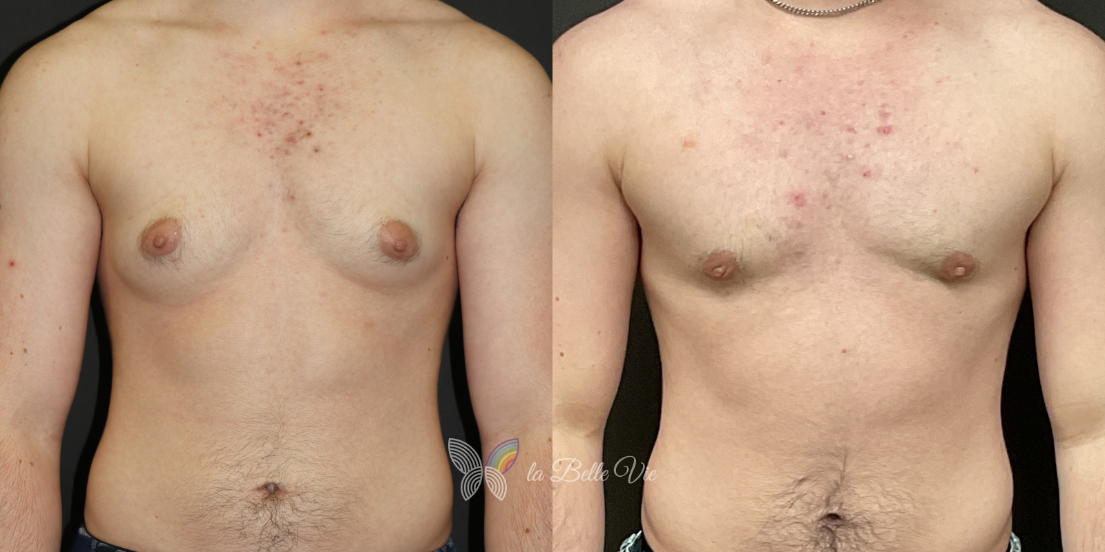 Before: The patient is 5 feet 4 inches tall, weighs 120 pounds, and has a body mass index (BMI) of 22.3. On examination, he presents with a small chest without ptosis. He has previously been on puberty blockers, which limited breast development; however, he is dissatisfied with the small feminine contour and desires removal.