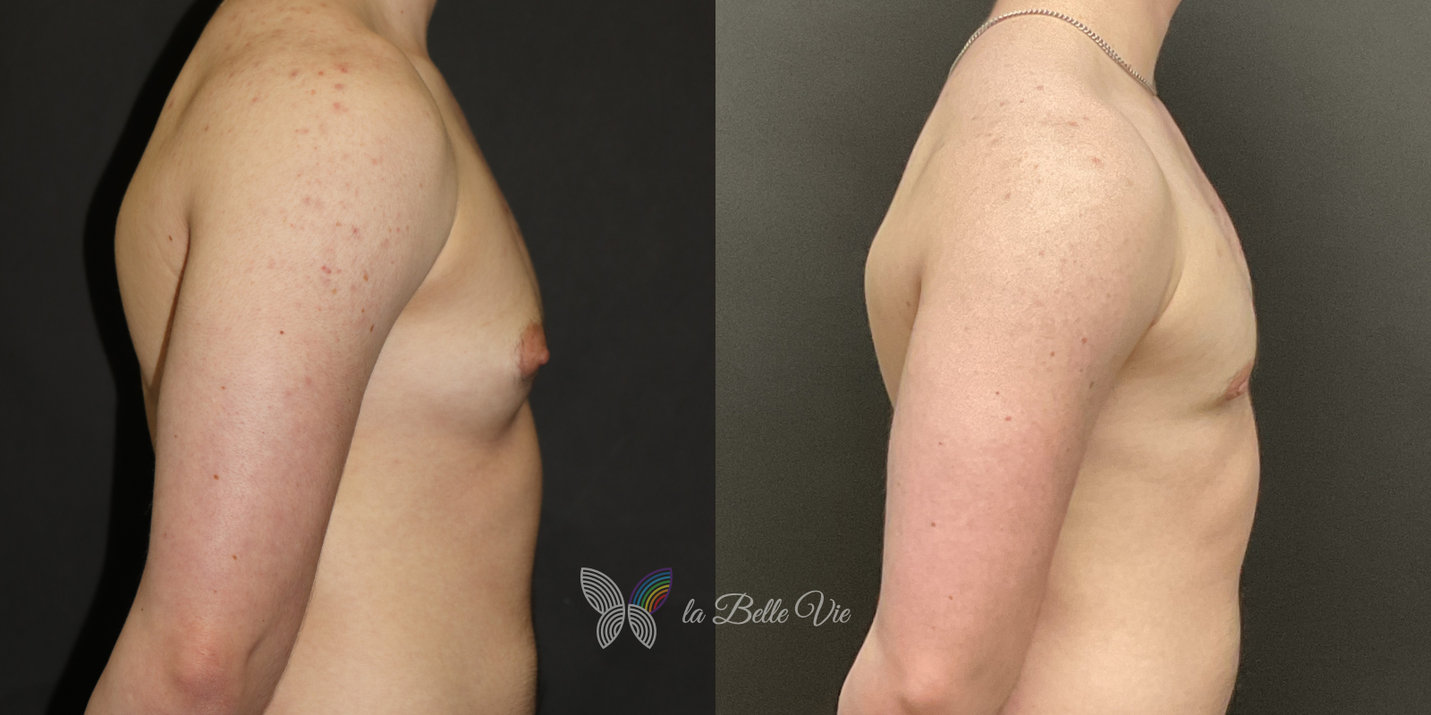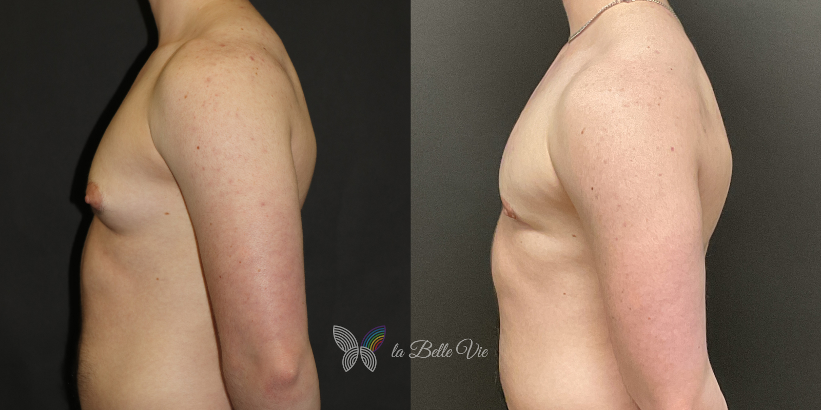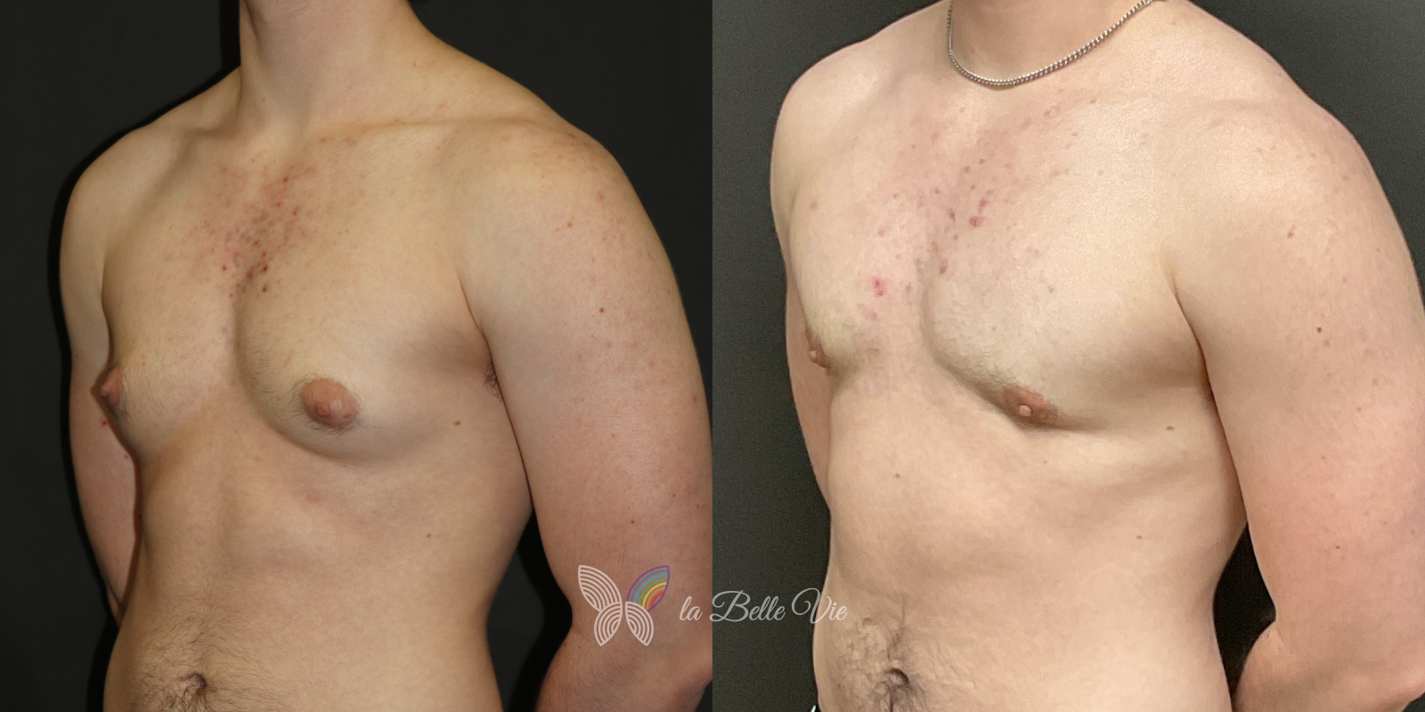Before: The patient is 5 feet 4 inches tall, weighs 120 pounds, and has a body mass index (BMI) of 22.3. On examination, he presents with a small chest without ptosis. He has previously been on puberty blockers, which limited breast development; however, he is dissatisfied with the small feminine contour and desires removal.